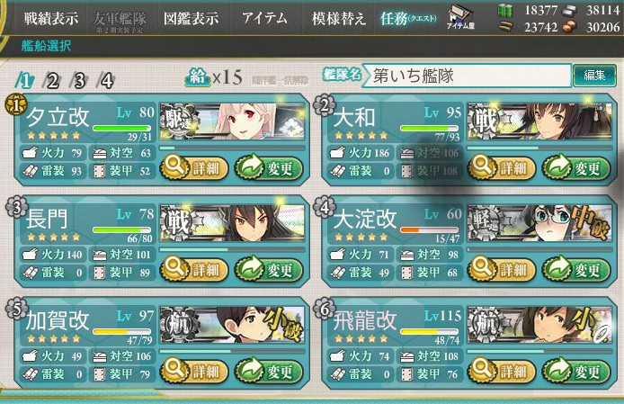 事前に攻略情報にも目を通しましたが、なるほどよく分からんってなってしまったのでAFHIルートで固定できそう且つ高火力な艦隊を組んでみました。ExtraOperationに挑むつもりもないし早々に大和投入です(`・ω・´)