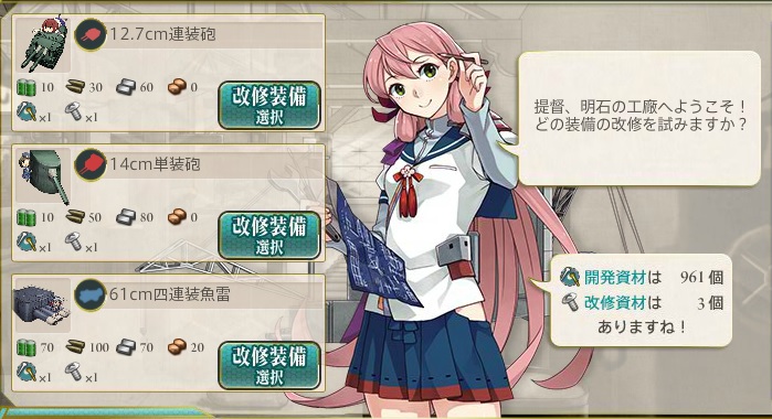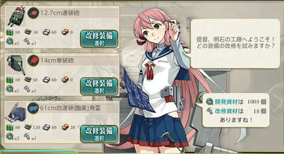 そういえば、先日のアプデで改修工廠なるシステムが追加されましたが、明石さんを旗艦にして工廠にポインタを持ってくと↓