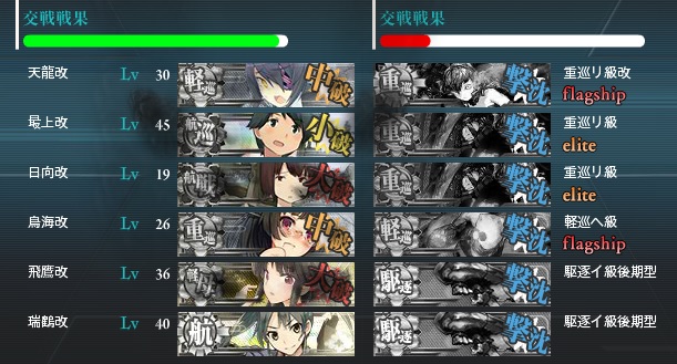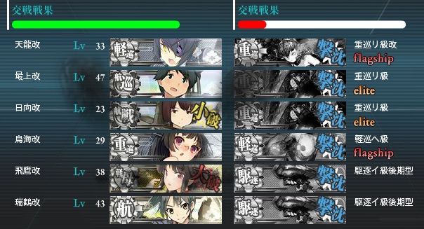 8戦目にしてようやく勝利!編成は見ての通りで軽巡・航巡・航戦・重巡・軽空・正空でルートは下です。