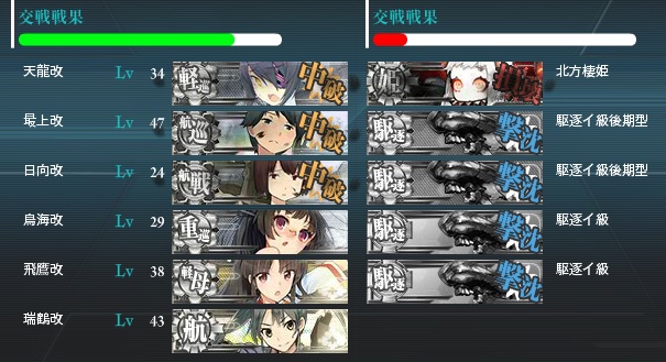 キラ付け無し、空母以外は主砲×2と電探か観測機装備、空母は爆・攻・戦・偵をまんべんなく装備しました。正直この編成や装備が効率良いとは思っていませんが、一度でもゲージを削れたらそれで押しとおるスタイルです^q^